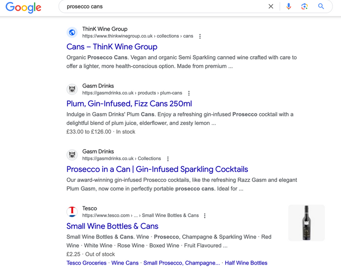 This included setting up a subscription model for automated repeat sales and optimizing their website for key search terms like "canned prosecco" and "prosecco in a can," which resulted in top SERP rankings.